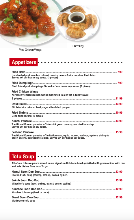 Hotstone Authentic Korean Cuisine, located in Olympia, WA, offers a wide range of authentic Korean dishes with options for vegans and vegetarians. Customers rave about the flavorful Korean comfort food, including favorites like kimchi pancake, kimchi fried rice, dumpling soup, tofu soup, bulgogi bowl, and scallion pancake. The friendly service and casual atmosphere add to the overall dining experience. The bibimbap with beef is praised for its colorful presentation and flavorful gochujang sauce, while the mixed tofu soup and bulgogi combo impress with tender meat and flavorful broth. The variety of banchan side dishes, including a delicious cucumber salad, enhance the overall meal. Whether you're a Korean cuisine enthusiast or a newcomer, Hotstone Authentic Korean Cuisine is a must-visit for a satisfying and authentic dining experience.